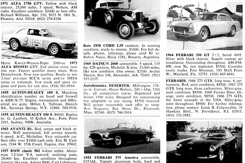 Wenn wir zum Beispiel in eine Nummer von Road & Track von 1973 schauen, und das ist erst 40 Jahre her, dann springen uns diverse attraktive Fahrzeuge ins Auge. In Miami Lakes verkauft ein Händler drei originale Ford GT40 Mk IV und einen Mk IIB (ohne Preisangabe, aber sicher günstig), in Los Angeles gibt es einen Ferrari 375 America Convertible (0353AL) zu kaufen, ein 300 SL, der gemäss Inseratetext wie neu aussah, kostete USD 8’500 (das waren damals ungerechnet etwa CHF 26’000 oder Euro 22’000), ein Mercedes Benz 300S Coupé von 1956 war für USD 5000 zu haben, und auch Exoten wie ein Marcos 2000 von 1965 (USD 3’250) oder ein Horch 830 BI von 1938 (USD 12’000) waren zu finden.