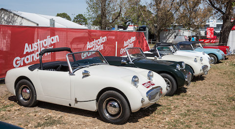 Alle stehen sie schön in Reih und Glied aufgereiht. Während in der Boxengasse die neuen V6-Turbo-Rennwagen für das bevorstehende Formel-1-Training zum Grand Prix von Australien von heute Freitag vorbereitet werden, stehen die Healeys neben dem V8-Star-Paddock bei strahlendem Sonnenschein auf der Wiese.