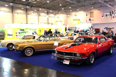 An der Techno Classica wurde der 50. Geburtstag des Pony-Cars auf dem Ford-Stand mit drei Ford T5/Mustang Modellen gefeiert (Bild oben).