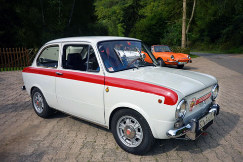In Rudolfshaus fanden sich auch überaus seltene Exemplare der Gattung Fiat 850 ein, so etwa ein roter Vignale Spider, ein gelber Siata oder ein wunderschöner Lombardi Grand Prix. Zudem gab es natürlich mehrere 850 Sport Coupé und Spider, wie auch drei 850 Special und einen seltenen Seat 133 Abarth zu bestaunen. Insgesamt war also die ganze Palette der Baureihe mit verschiedenen Motoren und in vielen Fiat-Farben vor Ort. Zu den Exoten auf dem Parkplatz gehörte ein Fiat 600 Abarth. Und kurz von der Abfahrt kamen unerwartet sogar noch zwei rote Fiat 124 Spider als Mitteilnehmer der Ausfahrt dazu. Damit waren mehr als 25 Fahrzeuge versammelt, als die Reise logsing.