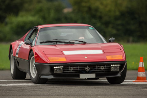 Beide Autos stammen aus der Mitte der Siebzigerjahre. Der Ferrari war damals mit 360 PS und 1515 kg der ultimative Supersportwagen. Die Werksangaben machten ihn damals mit 302 km/h Höchstgeschwindigkeit und 5,7s von 0-100 km/h zum schnellsten Strassensportwagen der Welt, was aber nicht ganz korrekt war, denn bei Tests der britischen Zeitschrift "Autocar" war bereits bei 263 km/h Ende Feuer. Rund 280 km/h, die bei anderen Magazinen gemessen wurden, machten ihn aber auch so konkurrenzlos schnell.
