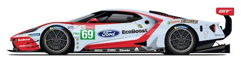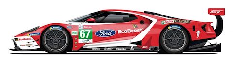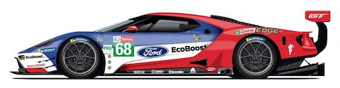 Der Nummer #68 Ford GT hat eine rot-blaue und weisse Lackierung, die auf Fords jüngstem Le-Mans-Sieger aus dem Jahr 2016 in der GTE-Pro-Klasse basiert. Und die gleichen drei Fahrer, Dirk Müller, Joey Hand und Sébastien Bourdais, kehren zurück, um ihn zu fahren.