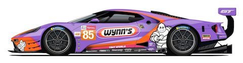 Zu diesem bunten Werksquartett gesellt sich ein fünfter speziell entwickelter Ford GT aus dem Kundenteam Keating Motorsports, der in der Amateur-Klasse "GTE Am" fährt. Die Nummer #85, die von Ben Keating, Jeroen Bleekemolen und Felipe Fraga gefahren wird, verwendet das gleiche Design wie die vier Fabrik-Fords, verwendet aber die Farben ihres Titelsponsors Wynn's.