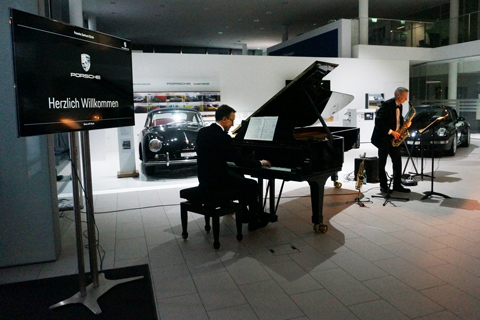 “The Lutz Brothers” gelang es als Duett mit dem Steinway-Flügel und Saxophon verschiedene musikalische Brücken über Swing-Klänge zu den Porsche Modellen 356, 911, 917, 993 und Carrera GT und deren Tonkulisse zu inszenieren.