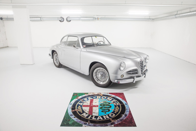 Dies ist hier, auf dem gezeigten Bild, zwar nicht wirklich der Fall, erweckt aber geradezu diesen Eindruck. Eine abgetrennte Einstellhalle innerhalb einer Tiefgarage wird in naher Zukunft einige Raritäten des italienischen Autoherstellers Alfa Romeo beherbergen. Etwas unkonventionell das eingelegte Alfa-Romeo-Emblem: Es wurde auf eine Folie auf Stoff gedruckt und mit einem transparenten PU überzogen. Dass sich hier schon bald einige Autos richtig wohl fühlen werden, versteht sich von selbst.