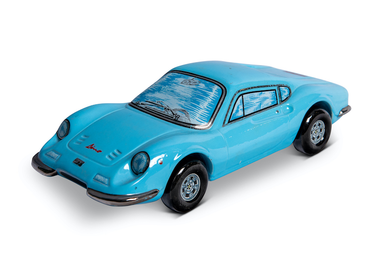 Alkohol und Autos passen für gewöhnlich nicht so gut zueinander. Mitte der Siebzigerjahre bot die Firma "Famous Firsts" aus New York trotzdem verschiedene Spirituosen in automobilförmigen Amphoren an. Neben Porsche 911 Targa und Chevrolet Corvette Sting Ray gab es auch den Dino 246 GT als Keramik-Dekanter in mehreren Farben. Auf einer Länge von rund 33 Zentimetern enthielt er 1 Pint (473 ml) Kentucky Straight Bourbon oder Pfefferminzlikör. Der Ausguss ragt dabei aber wie der Austritt einer Gasturbine riesengross und mittig aus dem Heck. Will man den Dino also auf seinen Rädern lagern, sollte man sicher sein, dass der Korken auch wirklich dichthält.