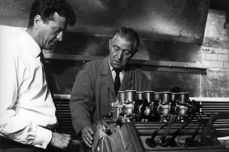 Zwei dieser Herren, deren Autos man eher kennt als ihre Gesichter, sind Jean Rédélé und Amédée Gordini. Die beiden Franzosen setzten nicht nur auf ihre Namen, sondern auch im Motorsport zahlreiche Akzente – zunächst unabhängig voneinander, später auch gemeinsam. Hier führt der "Hexer" (rechts) dem Alpine-Gründer im Juli 1967 seinen neuen Dreiliter-V8 vor, mit dem Alpine A211 und A220 später erfolgreich in der Sportwagen-Weltmeisterschaft antreten sollten.