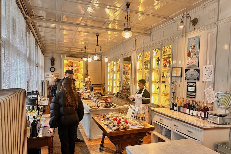 Einsiedeln bietet naturgemäss als wohl wichtigster Pilgerort der Schweiz eine reiche Auswahl an Gaststätten. Also galt es als erstes, einen Kaffee zu trinken. Dann folgte der Gang durch die Hauptgasse. Leider hatte die berühmte Bäckerei Goldapfel an ihrem Ursprungsstandort – es gibt auch ein modernes Ladengeschäft am Hauptplatz – noch zu, also blieb etwas Zeit für Umwege. Diese führten uns durch die Pferdestallungen des Klosters, durch die reich verzierte Klosterkirche und danach in einen Devotionalienladen mit Statuen, Kruzifixen, Plaketten, religiöser Literatur, Ex-Voto-Tafeln – und Krippenfiguren.