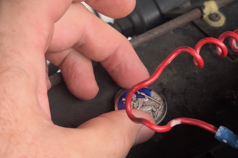 Und der Jaguar lief danach völlig problemlos. Dies hat mich dennoch nicht davon abgehalten, ihm eines der wichtigsten und nachhaltigsten Ersatzteile überhaupt zu gönnen. Das Wunderlichste daran: Es stammt ebenfalls aus besagtem Devotionalienladen. Wie? Nein, natürlich waren das nicht die Krippenfiguren. Das wäre ja völliger Quatsch. Es ist die Plakette des heiligen Christophorus. Sie trägt das Bildnis desselben Schutzheiligen der Reisenden, der wohl auch für die Namensgebung der Porsche-Hauszeitung hinzugezogen worden ist. Nun, Christophorus prangt jetzt mit dem kleinen Christus-Bübchen auf dem Buckel im Motorraum auf dem Kühlerrahmen, gleich neben der dort montierten Zündspule. Ich denke, das hilft.