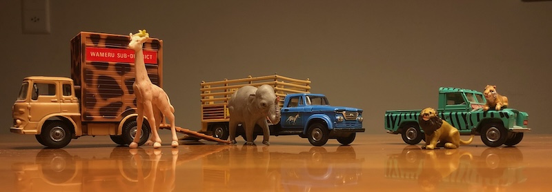 In der Stadt angekommen, hatte ich den ersten Erfolg meistens bei Manor, wo ich mich noch ganz genau an die Aufteilung der Gestelle in der Spielwarenabteilung erinnern kann. Es gab drei von wirklichem Interesse: Das eine war auf seiner Vorderseite der Marke Matchbox vorbehalten, auf der Rückseite fand sich dann das Sortiment von Corgi-Toys. Das andere war ein wildes Sammelsurium an Tonka-Blechlastern, japanischen Blechautos und den Perlen in 1/32 von Britains. Wobei mich zumeist nur deren Land-Rover-Derivate interessierten. Besonderes Augenmerk bei Corgi-Toys legte ich dabei immer auf noch vorhandene Modelle mit Gummireifen, mit den Plastikrädern der 1970er-Jahre, den Whizzwheels, konnte ich nicht so viel anfangen. DIE grosse Faszination war einst vor Weihnachten die Entdeckung des Gift-Sets Number 14, das grosse Daktari-Set mit einem Land-Rover, einem Dodge Fargo als Elefanten-Transporter und einem Bedford für die Giraffen. Dazu gab es die Figuren von Dr. Marsh Tracy, Judy the Chimp and Paul mit Clarence dem Löwen. Das muss wohl die ganze Heimfahrt ein Thema gewesen sein – normalerweise verbachte ich die Rückfahrt im überheizten Trolleybus mit beschlagenen Fenstern schlafend. 1975 lag das Daktari-Set unter unserem Weihnachtsbaum.