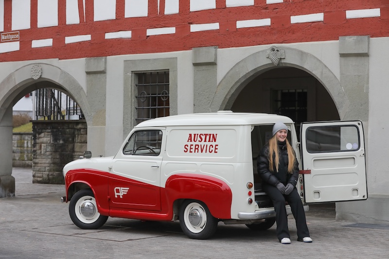 Mit Martin als Unterstützung drehte ich dann also mit 15 km/h in der Altstadt von Bülach mehrere Runden um das alte Rathaus, das übrigens farblich perfekt zum Van passte. An die Dimensionen des Autos musste ich mich zuerst einmal gewöhnen, da der Wagen ungewohnt schmal war. Zu meiner Überraschung war der Einschlag des Lieferwagens sehr gut, das Auto war wendig und liess sich leichtgängig durch die Gässlein führen. Das Herausnehmen vom Blinker ging mir mehrere Male vergessen, da ich mir das Klick-Geräusch der modernen Autos gewohnt war, das einem darauf aufmerksam macht, den Blinker wieder rauszunehmen. Erst als ich mir dann die Bilder durchgeschaut habe, ist mir aufgefallen, dass der Austin ja neben den Blinkern auch noch Winker wie damals aufwies. Ich habe mir davor nie Gedanken darüber gemacht, dass die verschiedenen Elemente des Autos früher anders funktioniert haben und so habe ich wieder etwas dazugelernt.