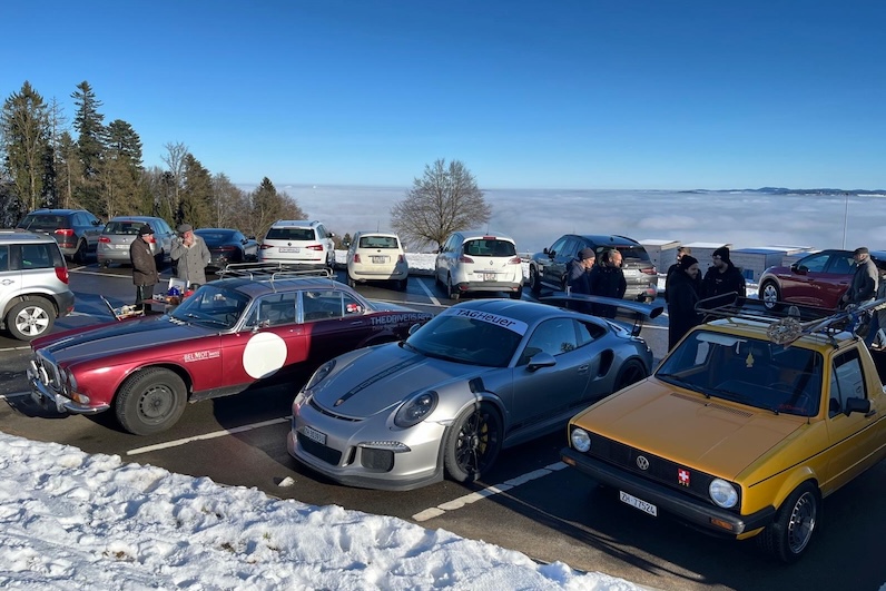 Dafür war die Selektion der mitgebrachten Autos umso interessanter: Mitsubishi Lancer Evo, Subaru Impreza Sti, VW Golf Caddy, ein Daimler Sovereign S1 oder ein Jaguar Mk 2 standen kunterbunt beisammen. Der weitaus jüngere Aston Martin DB 9 oder ein Porsche GT3 RS 991 wurden auch nicht verachtet. Mit meinem Fiat 500 von 2007 war mein fahrbarer Untersatz ganz gewiss keines Blickes wert, mit seinen 271'800 Kilometern ist er wohl noch eher einer meiner ganz persönlichen Klassiker.