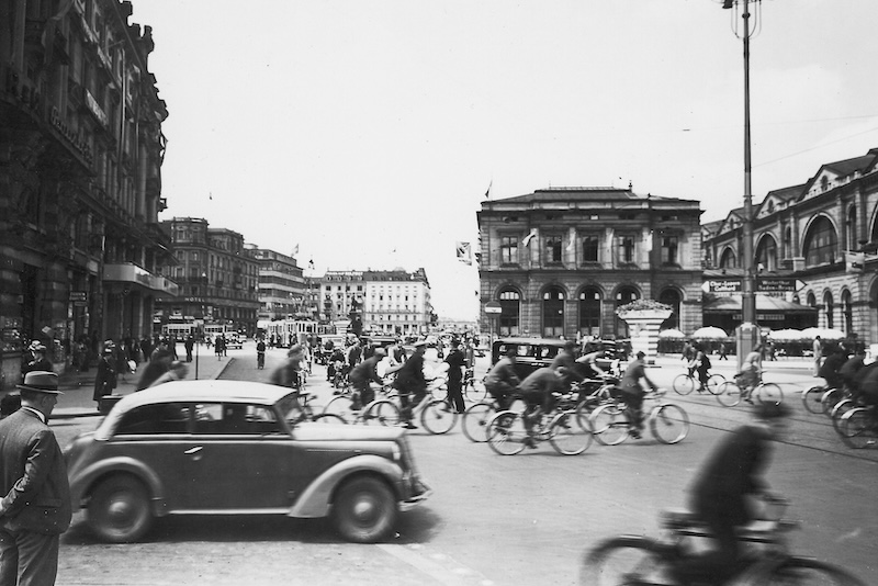 Mehr Autos – und viel mehr Fahrräder um 1939 wiederum vor dem Zürcher Hauptbahnhof © ETH e-pics