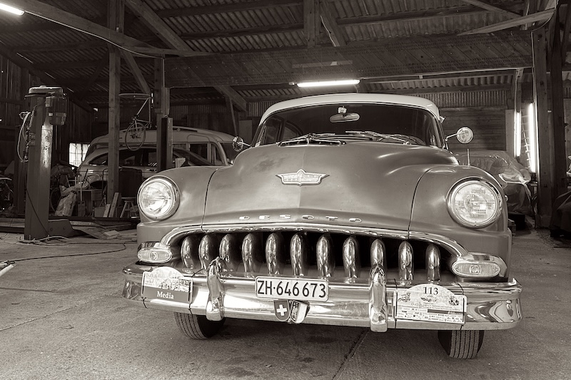 Mein eigener 1953er DeSoto Powermaster ist weder so stark noch so schnell. Die Bremsen aber haben mich, wie hier auch schon ausgeführt, in der jüngsten Zeit durchaus ebenso auf Trab gehalten. Nun hatte ich aber Glück und beim Spezialisten – den ich hier gerne nenne: Schacher Hydraulik in Inwil, Luzern oder – einen passenden Adapter gefunden. Damit sollten die Probleme behoben sein, und ich brauche nicht wie Roberto Belmar 1953 auch noch einen Beifahrer, Navigator und – Bremser zu engagieren. ...Bremser? Bitte? Absolut! Denn Belmars Wagen wurde dermassen schwach beim Anbremsen, dass sich der Beifahrer mit einer "Luftbremse" behelfen musste: Er stemmte beim Verzögern mit beiden Füssen die Türe des DeSoto auf! Immerhin kamen der Wagen wie die Besatzung so heil ins Ziel!