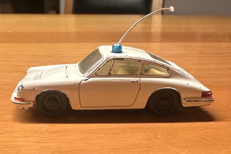 Der Markt war für mein Suchschema nicht ganz so erfolgreich, ich fand eigentlich nichts von Interesse. Der Charakter der Veranstaltung war wohl eindeutig mit Schwergewicht auf den Ausdruck Vide-Grenier ausgelegt. Da waren viel gerbauchter Krempel und wenige Preziosen. Also fuhr ich noch ein kleines Stück weiter, mittlerweile war es bereits früher Nachmittag. In Issenheim wurde am 1. Mai quasi das ganze Dorf abgesperrt für einen wirklich sehr grossen Flohmarkt – im Verhältnis zum Dorf. Man kann sagen, auch hier war die Ausbeute nicht gerade übergross, meine Suche nach antiquarischem Spielzeug und insbesondere nach Spielzeugautos blieb nahezu erfolglos. Allerdings offenbarte sich mir dann auf den zweiten Blick ein winziger, kleiner Porsche 911 auf einem der Verkaufstische. Beim zweiten Blick war es der Porsche 901 – das steht in der Tat noch auf dem Wagenboden – von Siku in der Polizeiausführung. Das Modell ist 1964 erstmals erschienen, das mag die ursprüngliche Typenbezeichnung erklären. Und wie durch ein Wunder hatte dessen lange Funkantenne aus Plastik überlebt. Die Dame nannte einen Betrag X, ich reichte ihr das Geld und sie korrigierte sich beim Anblick meiner Euroscheine – nach unten! Solche Missverständnisse sind mir die liebsten! Doch das Fazit meiner 250-Kilometer-Flohmarkt-Exkursion ins Elsass schien etwas mager: Ein winziges Autöli.