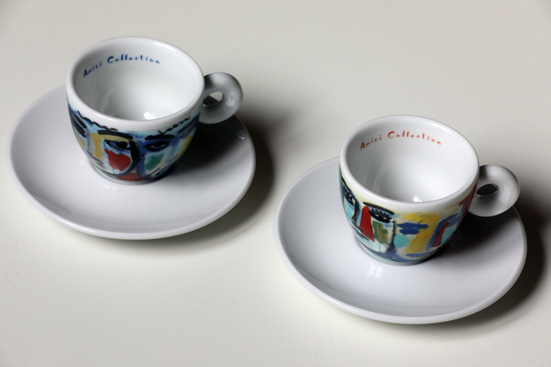 Und ja, seine Kunst erschien auch auf Espressotassen der Firma Amici Caffè, gegründet von Annemarie und Francesco Illy. Die künstlerischen Espressotassen sind gesucht, ein komplettes Set (6 Tassen mit Untertellern) wird schon einmal für EUR 300 angeboten.