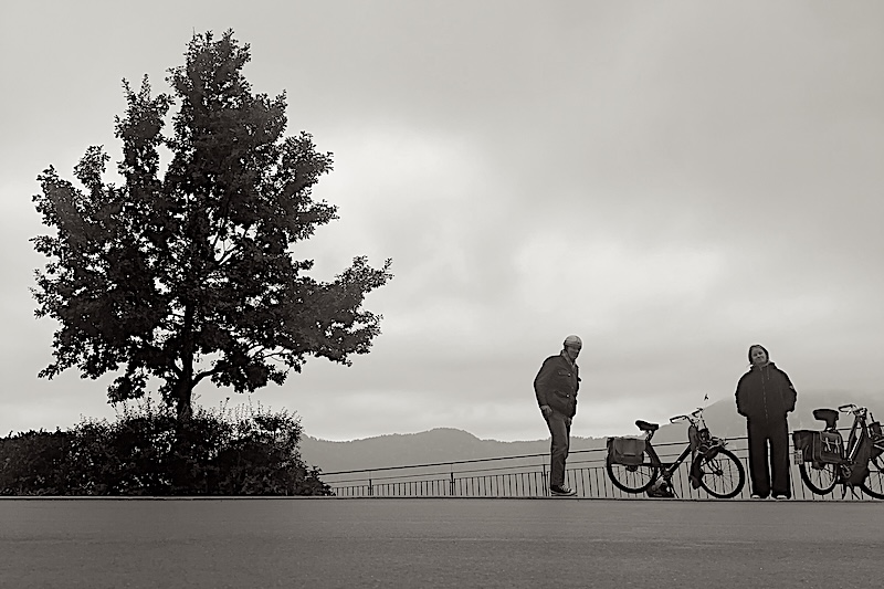 Wir fuhren weiter über Brunnen Richtung Gersau, nun auf der Südflanke der Rigi – und dies ist unmittelbar zu sehen. Denn hier wird die Vegetation plötzlich mediterran, der See und die Sonnenlage sorgen für ein ungewöhnlich mildes Klima. Mir aber war immer noch kalt – Mittelmeer? Pustekuchen! Dafür gab es herrliche Nebel-Herbststimmung entlang der Felsen bis nach Gersau. Leider musste ich dort erfahren, dass der Lauf der Dinge auch in dieser einstigen freien Republik nicht aufzuhalten ist. Aus dem früher mit typischen Lokalspezialitäten aufwartenden Seerestaurant Schwert ist mittlerweile ein Chinarestaurant geworden. Statt herbstlichem Wild gab es gebratene Nudeln mit Rindfleich. Nun denn, Details! Die Hobel hatten nach dem Essen noch schwerer zu schleppen, doch den Rest der Runde sollten sie klaglos meistern. In Weggis reichte uns deshalb die Zeit, um statt die Umfahrung zu wählen, mitten durch das Dorf umd am See entlang zu fahren. Bei Mark Twains Ecke entstand so ein Heldenfoto (Titelbild). Denn so ein Vater-Tochter-Moment, der sollte ja schon festgehalten werden.