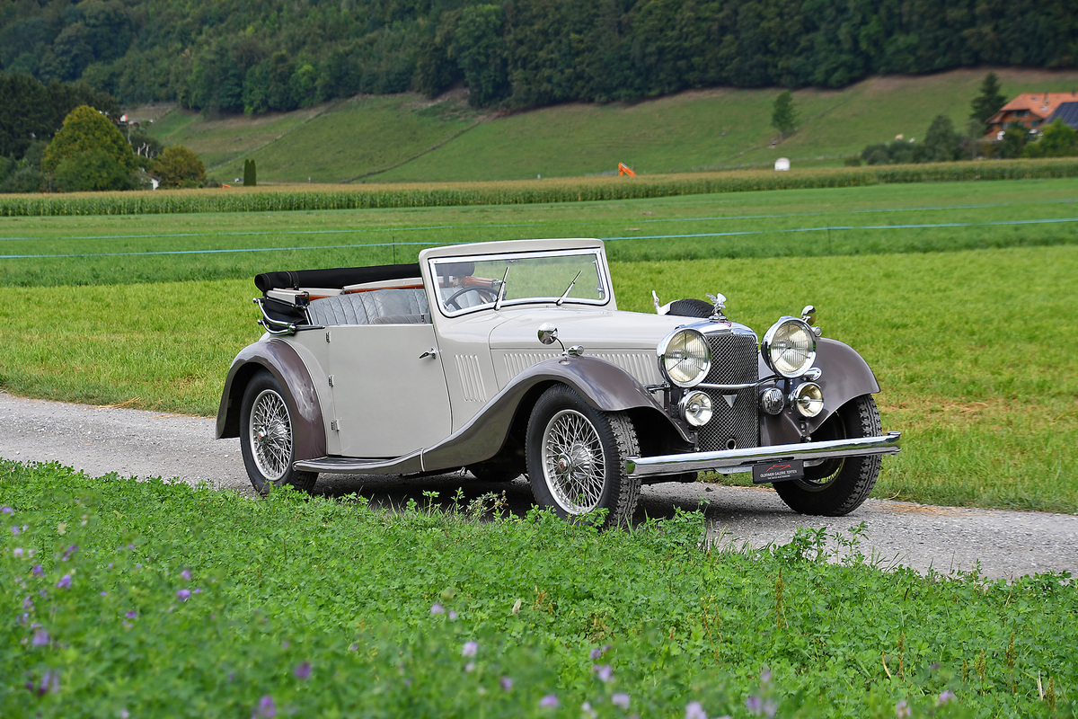 Als eines von nur 32 Speed Twenty SC Drophead Coupe’s mit Charlesworth Karosserie wurde dieser Alvis am 22. Dezember 1934 ausgeliefert, eine Kopie des Alvis Produktionsdatenblattes ist vorhanden. Damals noch blau mit blauer Lederausstattung ging das imposante Cabriolet an einen Mr. Walther Sharpe in Leicester. In den folgenden Jahren hatte der Speed Twenty – Chassis 17044 - 6 weitere englische Besitzer, wurde wohl in den 80er Jahren restauriert und in der aktuellen Farbkombination 1987 vom ersten und bislang einzigen Schweizer Besitzer erworben und importiert. Dieser nutzte den edlen Briten fortan für zahlreiche Ausflüge, weltweite Rallye-Teilnahmen (inkl. China) und Teilnahmen an verschiedenen Concours d‘Elegance. Der Wagen wurde stets gut gewartet und erhielt vor rund 10 Jahren einen typenkorrekten und revidierten Austauschmotor (12426). Eine Palette mit dem Originalmotor sowie einigen Ersatzteilen ist vorhanden und wird beim Verkauf mitgegeben. Aufgrund familiärer Veränderungen wurde der Alvis im August 2021 abgemeldet und eingelagert. Das seltene Cabriolet ist gut dokumentiert und befindet sich in gutem Zustand mit nutzungsbedingten Gebrauchsspuren. Die letzte MFK als Veteranenfahrzeug erfolgte im März 2020.