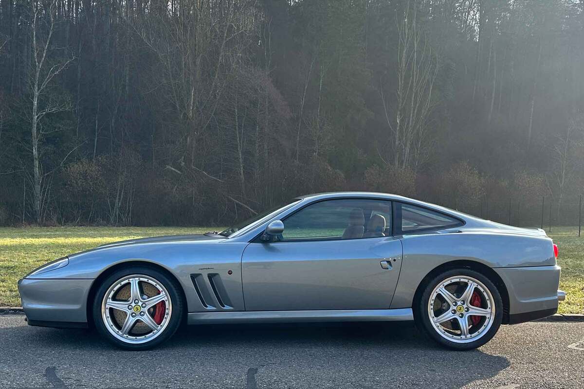 Dieser rare Ferrari 575M HGTC wurde im Februar 2005 von Ferrari SpA in Italien in der Farbe Grigio Titanio und Pelle Cuoio mit 6-Gang-Handschaltung und dem HGTC-Paket ausgeliefert. Er wurde stets bei Ferrari-Spezialisten gewartet und die bekannte Schwachstelle der klebrigen Soft-Touch-Schalter und -Griffe aufwändig behoben. Jüngst wurde der komplette Unterboden eisgestrahlt und sämtliche Schrauben ersetzt. Dieser wunderschöne Ferrari 575M HGTC befindet sich in top gepflegtem und absolut originalem Zustand. Die komplette Bordmappe mit sauber geführtem Serviceheft und allen originalen Unterlagen wie Bedienungs- und Betriebsanleitungen, Beschreibung der HGTC-Ausstattung etc. ist ebenso vorhanden wie der Lederkoffer mit Bordwerkzeug, Car-Cover und allen Schlüsseln.
