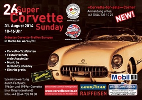 Diesen Sonntag, den 31. August 2014, werden sich ab 10:00 Uhr morgens hunderte von Corvette-Eigentümern und -Fans auf dem Wynecenter Areal in Buchs bei Aarau einfinden. Bestimmt werden alle sieben Generationen am grössten Corvette-Treffen Europas vertreten sein, welches nun schon zum 26. Mal ausgetragen wird.