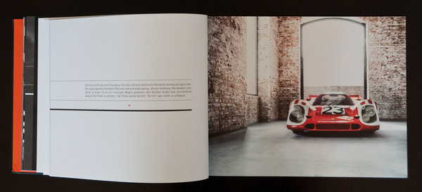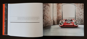You know that feeling when you open a book and then have to flip through a few pages to get to the heart of the matter? This book is completely different: the first wide-format double-page spread shows the famous photo of the 20 Porsche 917 longtails lined up in a row, ready for approval - your heart is already fluttering - turn the page again (the thick paper feels great, by the way): Table of contents, clearly laid out, beautifully designed. Numbers catch the eye: 904, Carrera 6, 917, 1000PS... In your mind you're already on a race track, your eyes fixed on a bend, waiting until you finally see a Porsche racing car hurtling around the corner...