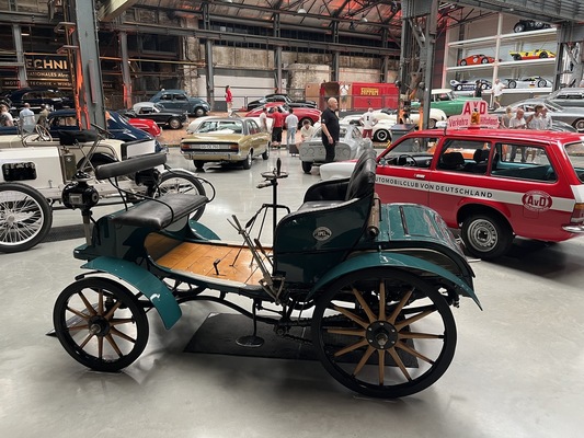 Inside, the Opel Patent Motor Car "System Lutzmann" from 1899 is the oldest exhibit in the special exhibition. It is the first Opel automobile ever, after the company had previously made a name for itself with the production of bicycles and sewing machines. Friedrich Lutzmann from Dessau was responsible for the design. Of the 65 units built, three still exist today. The 1545 cc single-cylinder engine produces 3.5 hp.