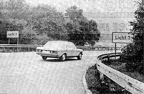 This picture comes from a 1982 issue of Automobil Revue. The photo was taken in Germany and the two "Lights?" signs are intended to warn drivers to switch off their lights!
