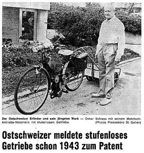 In 1943, in the midst of the turmoil of the Second World War, the inventor Oskar Schiess from eastern Switzerland designed a continuously variable transmission to be installed in a "multiple-drive motorcycle". In this transmission, the power was transmitted to pulleys with conical inner surfaces by means of belts. Together with springs, these provided force-dependent different ratios. Today, similar transmissions are known under the name Variomatic, which were mainly installed in DAF (later Volvo). It was not until long after the war that Oskar Schiess took up his invention again and fitted the gearbox together with an auxiliary motor to a ladies' bicycle. However, as an innovative inventor, this was not enough for him. He built batteries into a bicycle trailer, which drove two electric motors connected via a differential. This enabled him to roll through the villages quietly and emission-free. When the petrol engine was started, the electric motors switched off automatically and the batteries were charged at the same time. It's amazing what was possible decades before the hybrid and electric car hype!