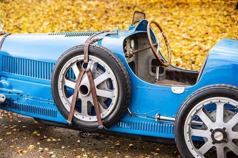 The picture shows a Peugeot Type PB1 "Bébé", built in 1912, with a spare wheel on the front right wheel.