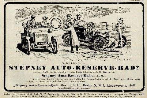 Advertisement in "Der Motorfahrer" No. 40 of October 4, 1907: "Pneumatic defects on the highway are no longer a horror for those who carry a Stepney Auto Spare Wheel."
