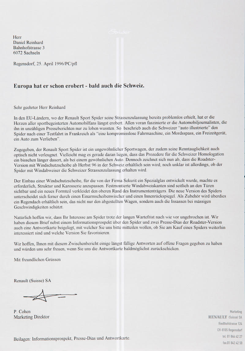 No carpet and no roof, no heating and no radio, only driving was the order of the day. I picked up the phone. Since we were talking about 1994, cell phones were not yet available, so I called Regensdorf on the corded phone at home and asked for Renault Sport boss André Hefti. I ordered the Spider on the phone. He laughed and said: "You, I still have no idea whether it will really be built and, if so, whether we'll even get any of them in Switzerland." I was persistent and placed my order. My order was then recorded on a blank white sheet of paper. A year passed, then came the happy news: "The car is being built" and the question from André: "Are you still interested?" - "Of course I am, I want the car." A short time later, I was able to tick the extras on a sales contract. The only choice was between yellow, blue or red. There was nothing else. Then several more months passed until the letter below arrived in my mailbox on April 25, 1996.