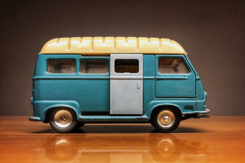An original from Dinky Toys France: The Estafette camping bus has plastic doors, while the replica has die-cast doors