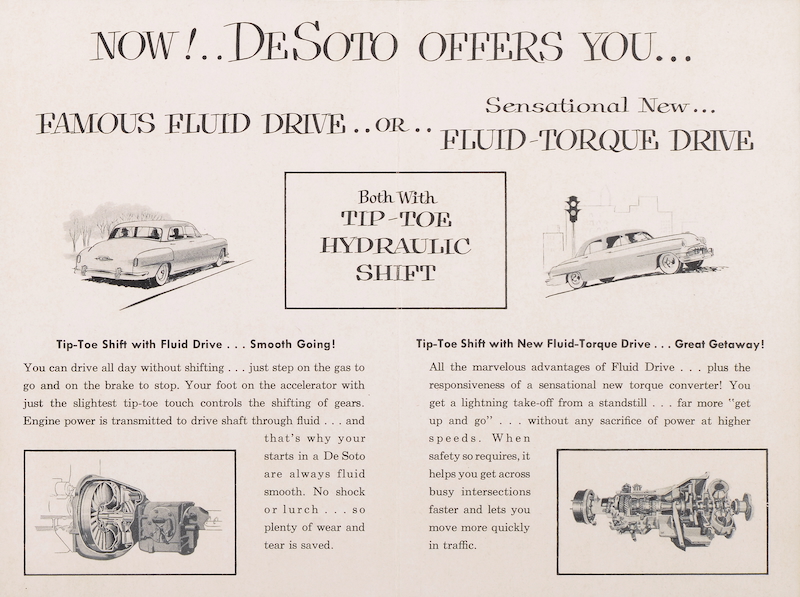 This means that the underdrive is engaged upstream. This is activated electro-hydraulically in the M6 transmission. Its predecessor still relied on pneumatic activation of the underdrive. To protect the entire mechanism, it has a freewheel to prevent load change impacts. In addition, the ignition is briefly interrupted during the shift process. Chrysler called this transmission in its models "Presto-Matic", at DeSoto it was this or the "Tip-Toe-Shift". Dodge received the same system in 1948 as Gyro-Drive and the low-budget Plymouth brand did not achieve it as "High-Drive" until 1953. But from the end of 1953, the top divisions already had the choice of a two-speed fully automatic transmission, the "Powerflite" with torque converter. This torque converter was also fitted to the last semi-automatic models on request.
