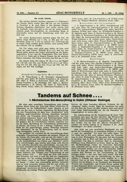 ... es längere Pausen, bis die nächsten Fahrer einkamen. Die letzten erreichten das Ziel um 11 Uhr. Die absolut beste Zeit fuhren W. M e r t o n auf Bugatti mit 7,56 Std. und Otto und Walter G 1 ö c k 1 e r auf Hanomag mit 7,57 Std. Sehr gut fuhr Nagl auf NSU mit Beiwagen, der 8,27 Std. benötigte. Ergebnisse: Gesamtwertung Solo-Motorräder: 1. W. Plapp-Hanau a. M. (Triumph), Gesamtfahrzeit 9,48 Std., gold. Adler; W. Förster-Frankfurt a. M. (Imperia) silb. Adler; A. Weber jr.-Nonnenhof (Opel) silb. Adler; W. Zinsser-Frankfurt a. M. (Zündapp) silb. Adler; L. Barthelmeß-Frankfurt a. M. (Horex) silb. Adler; K. Kahn-Heidelberg (Stock) bronz. Adler; Fr. Sesterhenn-Frankfurt a. M. (NSU) bronz. Adler; W. Link-Frankfurt a. M. (D-Rad) bronz. Adler; Ad. Wagner-Offenbach (Standard) bronz. Adler. Motorräder mit Seitenwagen: 1. A. Nagl-Frankfurt a. M. (NSU), Gesamtfahrzeit 8,27 Std., gold. Adler; Hs. Löbering-Frankfurt a. M. (AJS) gold. Adler; Frz. Eckhardt-Bieber (BMW) gold. Adler; Bach-Neu- Isenburg (D-Rad) gold. Adler; Ad. Wohlfahrth-Frankfurt a. M. (Imperia) gold. Adler; E. Starost-Frankfurt a. M. (Horex) silb. Adler; G. Weisenseel-Frankfurt a. M. (Harley-Davidson) silb. Adler; Hs. Kahrmann-Fulda (Herkules) silb. Adler; Jos. Weber-Frankfurt a. M. (Indian) bronz. Adler; Taylor-Darmstadt (AJS) bronz. Adler; Rieh. Werner-Heddernheim (Ariel Spez.) bronz. Adler; ...