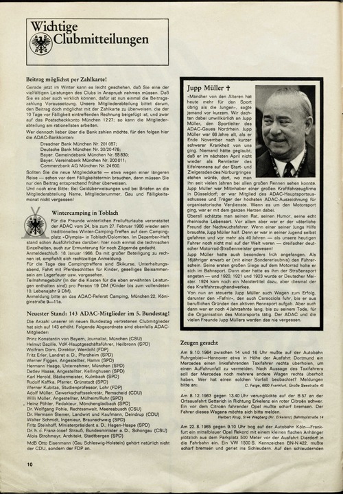 ... Und noch eine Bitte: Bei Geldüberweisungen und bei Briefen an die Mitgliederabteilung Name, Mitgliedsnummer, Gau und Fälligkeitsmonat nicht vergessen! Wintercamping in Toblach Für die Freunde winterlichen Freilufturlaubs veranstaltet der ADAC vom 24. bis zum 27. Februar 1966 wieder sein traditionelles Winter-Camping-Treffen auf dem Campingplatz »Olympia« in Toblach/Dolomiten. Im Dezember-Heft stand schon Ausführliches darüber; hier noch einmal die technischen Einzelheiten, auch zur Ermunterung für noch Zögernde gedacht. Anmeldeschluß: 18. Januar 1966. Da mit großer Beteiligung zu rechnen ist, empfiehlt sich rechtzeitige Anmeldung. Für die Tage des Campingtreffens sind Skikurse, Unterhaltungsabend, Fahrt mit Pferdeschlitten für Kinder, geselliges Beisammensein am Lagerfeuer usw. vorgesehen. Teilnahmegebühr (in der die Kosten für die eben erwähnten Leistungen enthalten sind) pro Person 19 DM (Kinder bis zum vollendeten 10. Lebensjahr 9 DM). Anmeldung bitte an das ADAC-Referat Camping, München 22, Königinstraße 9—11 a. Neuester Stand: 143 ADAC-Mitglieder im 5. Bundestag! Die Anzahl unserer im neuen Bundestag vertretenen Clubmitglieder hat sich auf 143 erhöht. Folgende Abgeordnete sind ebenfalls ADAC- Mitglieder: Prinz Konstantin von Bayern, Journalist, München (CSU) Helmut Bazille, VdK-Hauptgeschäftsführer, Heilbronn (SPD) Wolfram Dorn, ...