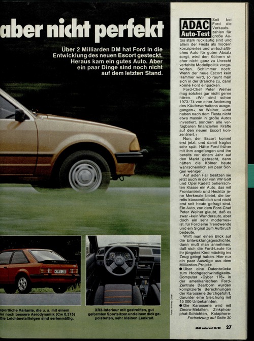 ... Auto-Test j Seit bei Ford die Verkaufszahlen für I große Autos stark rückläufig sind und allein der Fiesta als modern konzipiertes und wirtschaftliches Auto für guten Absatz sorgt, wird den Kölnern sicher nicht ganz zu Unrecht verfehlte Modellpolitik vorgeworfen. Schlimmer noch: Wenn der neue Escort kein Hammer wird, so raunt man sich in der Branche zu, dann könne Ford einpacken. Ford-Chef Peter Weiher mag solches gar nicht gerne hören. »Wir sind schon 1973/74 von einer Änderung des Käuferverhaltens ausgegangen«, so Weiher, »und haben nach dem Fiesta nicht etwa massiv in große Autos investiert, sondern alle verfügbaren finanziellen Kräfte auf den neuen Escort konzentriert.« Nun, der Escort kommt erst jetzt, und damit fraglos sehr spät. Hätte Ford früher mit ihm angefangen und ihn bereits vor einem Jahr auf den Markt gebracht, dann hätten die Kölner heute wahrscheinlich ein paar Sorgen weniger. Auf jeden Fall besitzen sie jetzt auch in der von VW Golf und Opel Kadett beherrschten Klasse ein Auto, das mit Frontantrieb und Hecktür jene Merkmale bietet, die bereits klassenüblich und nicht erst seit heute gefragt sind. Ein Auto, von dem Ford-Chef Peter Weiher glaubt, daß es zwar »kein Wunderauto, aber doch ein sehr modernes« ist, für Ford eine Trendwende und ein Signal zum Aufbruch bedeute. Wirft man einen Blick ...