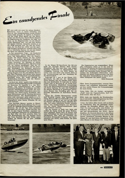 ... daß man bange war, sie würden umschlagen. Aber die virtuose Steuerkunst der Fahrer und die artistische Wendigkeit der Beifahrer meisterten jeden noch so gefährlich aussehenden Moment. Für den Motorbootsport war die letzte diesjährige Regatta trotz des scheußlichen Wetters eine echte Werbung, weil gerade unter diesen Bedingungen die Teilnehmer sportliche Höchstleistungen boten. Das zeigen deutlich die Wochenschau-Aufnahmen und die Meisterschüsse der Kameramänner. An Bord der „Köln" machte Jules Köther als Präsident desDeutschenMotoryacht-Verbandes die Honneurs. Er begrüßte u. a. den Wirtschaftsund Verkehrsminister des Landes Nordrhein-Westfalen, Dr. Kohlhase, den Düsseldorfer Oberbürgermeister Glock, den Vizepräsidenten des ADAC, Hans Bretz, den 2. Vorsitzenden des ADAC-Gaues Nordrhein, Hermann Schiessmann, und Dr. Rosterg, den neuen Weltrekordmann. Der Bundespräsident war leider nicht anwesend; dafür sandte er in Erinnerung an das schöne Erlebnis des Vorjahres telegraphisch seine besten Wünsche für ein gutes Gelingen. Drei Deutsche Meister wurden in Düsseldorf gekrönt. In der Autbordklasse bis 175 ccm wurde die 19jährige Sigrud Knubben Deutsche Meisterin. Sie ist der Typ eines modernen Sportgirls mit viel Herz, Charm und Mut. Der Stil, in dem Sigrud Knubben, assistiert von ihrer 16jährigen Schwester Ute als ...