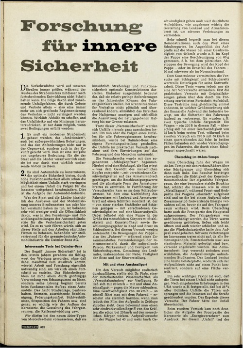 ... allein schon die Möglichkeit eines Unfalls stark verringern und bei einem Unfall die Folgen für die Insassen weitgehend herabmindern. Dies ist die Aufgabe der Automobil-Industrie. Was der Staat und die Länder hinsichtlich des Ausbaues und der Modernisierung unseres Straßennetzes tun oder bisher versäumt haben zu tun, ist bekannt; sehr viel weniger weiß die Öffentlichkeit davon, was in den Forschungsund Entwicklungsabteilungen der Automobilindustrie für die Verkehrssicherheit getan wird. Da es zu weit führen würde, sich an dieser Stelle mit den Arbeiten sämtlicher Firmen zu befassen, behandeln wir stellvertretend für die gesamte deutsche Automobilindustrie die Daimler-Benz AG. Interessante Tests bei Daimler-Benz Der Begriff „innere Sicherheit" ist in den letzten Jahren geradezu ein Schlagwort der Werbung geworden, ohne daß dabei manchmal zum Ausdruck kommt, wieviel Arbeit und Forschung eigentlich notwendig sind, um wirklich einen Fortschritt zu erzielen. Das Sicherheitsproblem ist nicht allein durch großzügige Verwendung von Schaumgummi zu lösen, sondern seine Lösung beginnt bereits beim fundamentalen Aufbau eines Automobils. Das heißt Straßenlage, Lenkverhalten, Bremsen, ausreichende Beschleunigung, Federungskomfort, Sichtverhältnisse, Sitzposition des Fahrers usw. sind genau so wichtig wie der Aufbau der Karosserie, ...