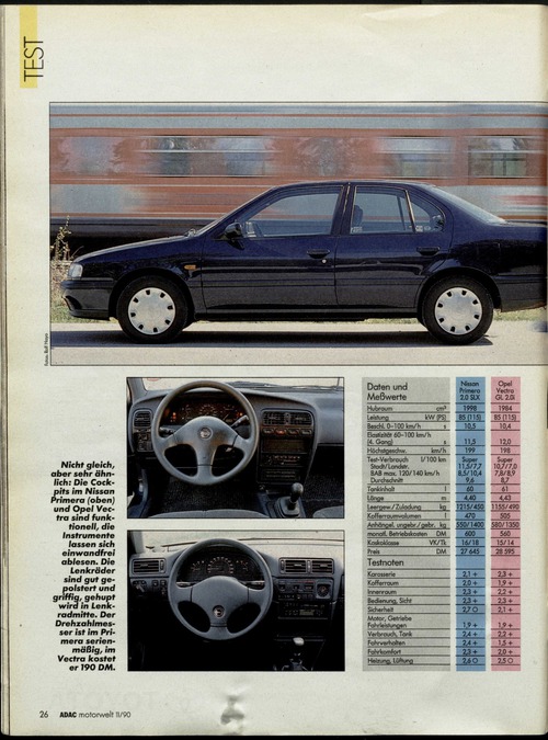 ... CO LU I— Nicht gleich, aber sehr ähnlich: Die Cockpits im Nissan Primera (oben) und Opel Vectra sind funktionell, die Instrumente lassen sich einwandfrei ablesen. Die Lenkräder sind gut gepolstert und griffig, gehupt wird in Lenkradmitte. Der Drehzahlmesser ist im Primera serienmäßig, im Vectra kostet er 190 DM. Daten und Meßwerte Nissan Primera 2.0 SLX Opel Vectra GL 2.01 Hubraum cm3 1998 1984 Leistung kW (PS) 85 (115) 85 (115) Beschl. 0-100 km/h s 10,5 10,4 Elastizität 60-100 km/h (4. Gang) s 11,5 12,0 Höchstgeschw. km/h 199 198 Test-Verbrauch i/100 km Stadt/Landstr. BAB max. 120/140 km/h Durchschnitt Super 11,5/7,7 8,5/10,4 9,6 Super 10,7/7,0 7,8/8,9 8,7 Tankinhalt 60 61 Länge m 4,40 4,43 Leergew./Zuladung kg 1215/450 1155/490 Kofferraumvolumen 470 505 Anhängel. ungebr./ gebr. kg 550/1400 580/1350 monatl. Betriebskosten DM 600 560 Kaskoklasse VK/Tk 16/18 15/14 Preis DM 27 645 28 595 Testnoten Karosserie 2,1 + 2,3 + Kofferraum 2,0 + 1,9 + Innenraum 2,3 + 2,2 + Bedienung, Sicht 2,3 + 2,3 + Sicherheit 2,7 0 2,1 + Motor, Getriebe Fahrleistungen 1,9 + 1,9 + Verbrauch, Tank 2,4 + 2,2 + Fahrverhalten 2,4 + 1,5 + Fahrkomfort 2,3 + 2,0 + Heizung, Lüftung 2,6 O 2,5 O 26 ADAC motorweit 11/90 ...