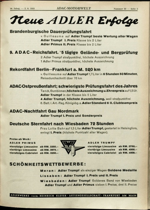... Jahr«. — 2. 6. 1933 ADAC-MOTORWELT N ummer 22 — Seile 5 7t*ue, ADLER ErfoCge Brandenburgische Dauerprüfungsfahrt v. Guilleaume auf Adler Trumpf beste Wertung aller Wagen Adler Trumpf I. Preis Klasse bis 2 Liter Adler Primus II. Preis Klasse bis 2 Liter 9. ADAC-Reichsfahrt. *5 tägige Geländeund Bergprüfung 2 Adler Trumpf strafpunktfrei, höchste Auszeichnung 1 Adler Primus strafpunktfrei, höchste Auszeichnung Rekordfahrt Berlin—Frankfurt a. M. 5^0 km V. 6 u i 11 e a u m e auf Adler Trumpf 1,7 Liter in 6 Stunden 50 Minuten, Reisedurchschnitt über 76 km ADAGOstpreußenfahrt; schwierigste Prüfungsfahrt des Jahres Tan ck, Gumbinnen.höchste Auszeichnung u. Ehrenpreis auf 1,5 Ltr. Adler Trumpf in der Klasse bis 5 Liter 4 Adler Trumpf, höchste Auszeichnung, weil strafpunktfrei 6. Batt. I.Art.-Reg. Königsbg.a. AdlerStandard 6 II. Clubteampreis ADAC-Nachtfahrt Gau Nordmark Adler Trumpf I. Preis und Sonderpreis Deutsche Sternfahrt nach Wiesbaden 72 Stunden Frau Lotte Bahr auf 1,5 Liter AdlerTrumpf, gestartet in Helsingfors, erringt I. Preis (höchste Punktzahl aller Wagen). Preise ab Werk: ^^^^^^^ ADLER PRIMUS ADLER TRUMPF viersitzige Limousine ab RM. 3350.- viersitzige Limousine ab RM. 3750.- viertürige Limousine ab RM. 3975.- ' VfrlI ''^^^^ viertürige Limousine ab RM. 4200.- viersitziges Cabriolet ab RM. 3950.- If viersitziges Cabriolet ab RM. ...