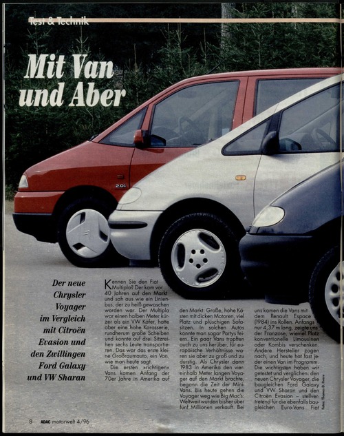 ... motorweit 4/96 den Markt: Große, hohe Kä- sten mit dicken Motoren, viel Platz und plüschigen Sofasitzen. In solchen Autos konnte man sogar Partys feiern. Ein paar Vans tropften auch zu uns herüber, für europäische Verhältnisse waren sie aber zu groß und zu durstig. Als Chrysler dann 1983 in Amerika den viereinhalb Meter langen Voyager auf den Markt brachte, begann die Zeit der Mini- Vans. Bis heute gehen die Voyager weg wie Big Macs: Weltweit wurden bisner über fünf Millionen verkauft. Bei uns kamen die Van; dem Renault Es (1984) ins Rollen. A nur 4,37 m lang, zeigte uns der Franzose, wieviel Platz konventionelle Limousinen oder Kombis verschenken. Andere Hersteller zogen nach, und heute hat fast jeder einen Van im Programm. Die wichtigsten haben wir getestet und verglichen: den „ neuen Chrysler Voyager, die S baugleichen Ford Galaxy ^ und VW Sharon und den | Citroen Evasion - stellver- 1 tretend für die ebenfalls baug gleichen Euro-Vans Fiat 5 Kennen Sie den Fiat Multipla? Der kam v 40 Jahren auf den Maria und sah aus wie ein Linienbus, der zu heiß gewaschen worden war. Der Multipla war einen halben Meter kürzer als ein VW Käfer, hatte aber eine hohe Karosserie, rundherum große Scheiben und konnte auf drei Sitzreihen sechs Leute transportieren. Das war das erste kleine Großraumauto, ein Van, wie man heute ...