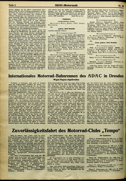 ... der Fahrt beheben wollte. Das machte besonders bei der Steilstrecke einen sonderbaren Eindruck. Weshalb der Fahrer nicht anhielt und die Leitungen reinigte, ist mir unklar, zumal er auf der Strecke gut aufholen konnte. So kosteten die drei verspäteten Minuten dem Stoewer-Team die große Medaille. Daß der Mercedes-Nürburgtyp mit den Kanonen Caracciola, Walb, Merz diesen Wettbewerb spielend erledigen würde, war klar und doch hatte der „gewöhnliche 4000-Mark-Ford" mit seinen vier Zylindern gerade soviel drin! Eine sehr beachtenswerte Beobachtung, welche sicher sehr viele Zuschauer zum Nachdenken veranlaßte. Ich bin der Auffassung, daß derartige Wettbewerbe, wenn wirkliche Serien wagen nur in Frage kommen, für die Industrie und vor allem auch für die Interessenten mehr wert sind als mehrtägige Hetzjagden mit frisierten Motoren über Alpenpässe. Hoffentlich sieht das unsere Industrie bald ein — und arbeitet dann der ADAC noch weitere Bestimmungen aus, die den heutigen Verhältnissen in allein Rechnung tragen, dann können wir mit einem ehrlichen „Töff, töff, hurra!" schon heute die Sportsaison 1930 begrüßen. Adolf Meurer. Ergebnisse: Strafpunktfreie Teams: Mercedes-Benz, Röhr, NSU, Steyr, H a n o m a g. Die goldene ADAC-Medaille erhielten folgende Fahrer: Wertungsgruppe IV: Rudolf Caracciola - Berlin (Mercedes-Benz), Otto M e r ...
