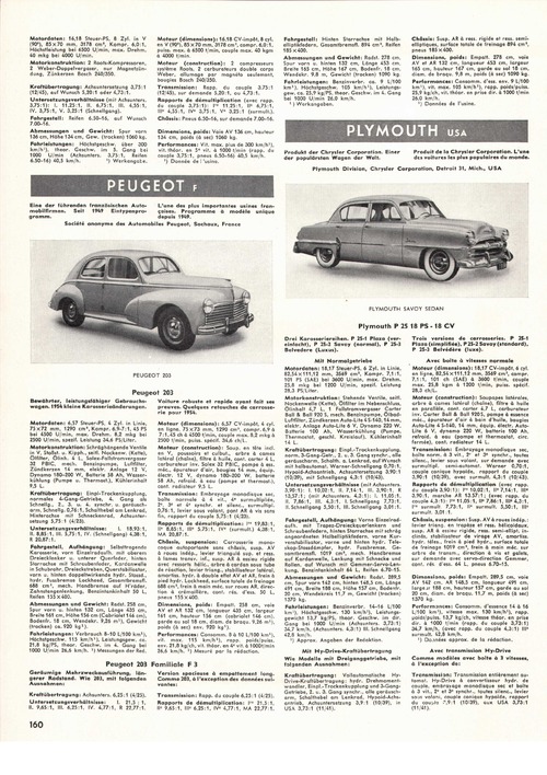 ... 2 carburateurs double corps Weber, allumage par magnéto seulement, bougies Bosch 240/350. Transmission: Rapp. du couple 3,75:1 (12/45), sur demande 5,20:1, ou 4,73:1. Rapports de démultiplication (avec rapp. du couple 3,75:1): I'« 11,25:1, II« 6,75:1, III" 4,55:1, I% 3,75:1, V 3,25:1 (surmult.). Châssis: Pneus 6.50-16, sur demande 7.00-16. Dimensions, poids: Voie AV 136 cm, hauteur 134 cm, poids (à sec) 1060 kg. Performances: Vit. max. plus de 300 km/h*), vit. théor. en 5« vit. à 1000 t/min (rapp. ducouple 3,75:1, pneus 6.50-16) 40,5 km/h. *) Donnée de I 'usine. PEUGEOT Eine der führenden französischen Auto- L'une des plus importantes usines franmobilfirmen. Seit 1949 Eintypenpro- çaises. Programme à modèle uniquegramm. depuis 1949. Société anonyme des Automobiles Peugeot, Sochaux, France PEUGEOT 203 Peugeot 203 Bewährter, leistungsfähiger Gebrauchswagen. 1954 kleine Karosserieänderungen. Motordaten: 6,57 Steuer-PS, 4 Zyl. in Linie, 75X72 mm, 1290 cm», Kompr. 6,9-7:1, 45 PS bei 4500 U/min, max. Drehm. 8,2 mkg bei 2500 U/min, spezif. Leistung 34,6 PS/Liter. Motorkonstruktion: Schräghängende Ventile in V, Stoßst. u. Kipph., seitl. Nockenw. (Kette),ölfilter, Ölinh. 4 L, Solex-Fallstromvergaser 32 PBIC, mech. ...