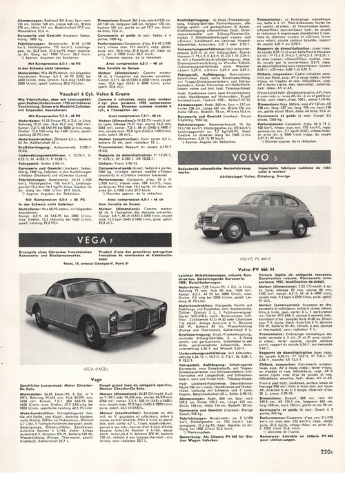 ... 20,8 resp. 21,8 kg/ch. vit. théor. en prise dir. à 1000 t/min 26,1 km/h. *) Données approx. de la rédaction. Avec compression 6,5:1 - 46 ch Non livrable en Suisse. Moteur (dimensions): Comme moteur 48 ch, à l'exception des données suivantes:Compr. 6,5:1, 46 ch(SAE) à 4000 t/min, couple max. 10,6 kgm (SAE) à 2000 t/min, puiss.specif. 30,6 ch/L. Vauxhall 6 Cyl. Velox & Cresta Wie Vierzylinder, aber mit leistungsfähigem Sechszylindermotor. 1955 mit höhererVerdichtung. Daten wie Modell 4-Zylinder,mit folgenden Ausnahmen: Mit Kompression 7,3:1 ? 68 PS Motordaten: 11,52 Steuer-PS, 6 Zyl. in Linie,Bohrung 79,37 mm, Hub 76,2 mm, 2262 cm', Kompr. 7,3:1, 68 SAE-PS bei 4000 U/min, max. Drehm. 15,8 SAE-mkg bei 1400 U/min, spezif. Leistung 30 PS/Liter. Motorkonstruktion: ölinhalt 4,5 L, Batterie 53 Ah, Kühlerinhalt 10 L. Kraftübertragung: Achsuntersetz. 4,125:1 (8/33). Untersetzungsverhältnisse: I. 12,79:1, II. 6,72:1, IM. 4,125:1, R 12,82:1. Fahrgestell: Reifen 5.90-15. Karosserie und Gewicht (trocken): Sedan,4türig, 1060 kg, lieferbar in den Ausführungen «Velox» (Standard) und «Cresta» (Luxus). Fahrleistungen: Benzinverbr. 10-11 L/100 km*), Höchstgeschw. 130 km/h*), Leistungsgewicht15,6 bzw. 16,1 kg/PS, theor. Geschw. im dir. Gang bei 1000 U/min 29,9 km/h.*) Approx. Angaben ...