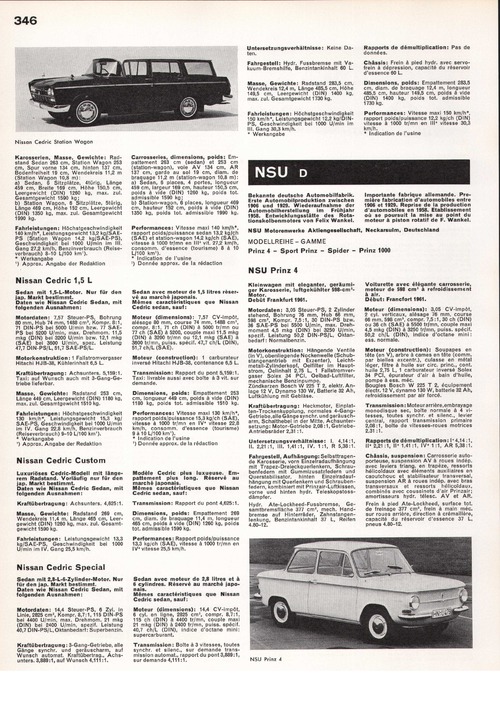 ... Cedric Station Wagon Karosserien, Masse, Gewichte: Radstand Sedan 263 cm, Station Wagon 253 cm, Spur vorne 134 cm, hinten 137 cm, Bodenfreiheit 19 cm, Wendekreis 11,2 m(Station Wagon 10,8 m): a) Sedan, 6 Sitzplätze, 4türig, Länge 459 cm, Breite 169 cm, Höhe 150,5 cm,Leergewicht (DIN) 1260 kg, max. zul. Gesamtgewicht 1590 kg;b) Station Wagon, 6 Sitzplätze, 5türig,Länge 469 cm, Höhe 152 cm, Leergewicht(DIN) 1350 kg, max. zul. Gesamtgewicht 1990 kg. Fahrleistungen: Höchstgeschwindigkeit 140 km/h*, Leistungsgewicht 13,2 kg/SAE- PS (Station Wagon 14,2 kg/SAE-PS),Geschwindigkeit bei 1000 U/min im III.Gang 27,2 km/h, Benzinverbrauch (Reiseverbrauch) 8-10 L/100 km*).* Werkangabe *) Approx. Angabe der Redaktion Nissan Cedric 1,5 Sedan mit 1,5-L-Motor. Nur für denjap. Markt bestimmt. Daten wie Nissan Cedric Sedan, mitfolgenden Ausnahmen: Motordaten: 7,57 Steuer-PS, Bohrung 80 mm, Hub 74 mm, 1488 cm', Kompr. 8:1, 71 DIN-PS bei 5000 U/min bzw. 77 SAE- PS bei 5200 U/min, max. Drehmom. 11,5mkg (DIN) bei 3200 U/min bzw. 12,1 mkg(SAE) bei 3600 U/min, spez. Leistung 47,7 DIN-PS/L, 51,7 SAE-PS/L. Motorkonstruktion: 1 Fallstromvergaser Hitachi HJB-38, Kühlerinhalt 6,5 L. Kraftübertragung: Achsunters. 5,159:1. Taxi: auf Wunsch auch mit 3-Gang-Getriebe lieferbar. Masse, Gewichte: Radstand 253 cm,Länge 449 cm, Leergewicht (DIN) 1180 kg, max. zul. Gesamtgewicht 1510 kg. ...