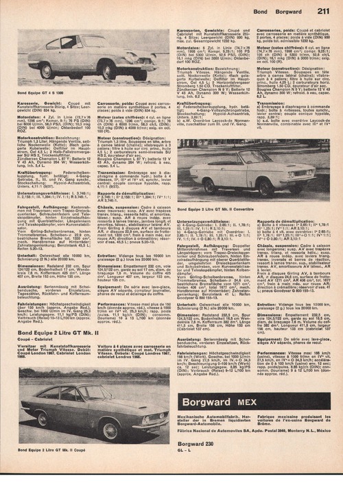 ... hinten Einzelradaufhängung mit Querblattfeder, Längslenkern und Teleskopdämpfer, vorn Kurvenstabilisator. Vorn Girling-Scheibenbremse, hintenTrommelbremse, Scheiben- 0 22,9 cm, bestrichene Bremsfläche tot. 1320 cm', mech. Handbremse auf Hinterräder;Zahnstangenlenkung; Benzintank 45,5 L; Reifen 5.20-13. Unterhalt: Oelwechsel alle 10000 km,Schmierung (2 N.) alle 20000 km. Dimensionen: Radstand 232 cm, Spur 124/122 cm, Bodenfreiheit 17 cm, Wendekreis 7,6 m. Kofferraum 425 dm'. Länge 407 cm, Breite 153 cm, Höhe 135 cm. Ausrüstung: Serienmässig mit Scheibendusche, vorderen Einzelsitzen,Tageszähler, Rückfahrund Kofferraumbeleuchtung. Fahrleistungen: Höchstgeschwindigkeit über 150 km/h (approx. Angabe Red.), Geschw. bei 1000 U/min im IV. Gang 25,3km/h; Leistungsgew. 11,1 kg/PS (DIN); Verbrauch (Reise) 10-13 L/100 km (approx. Angabe Red.). Bond Equipe 2 Litre GT Mk. Coupé - Cabriolet Viersitzer mit Kunststoffkarosserieund Motor Triumph Vitesse. Debüt: Coupé London 1967, Cabriolet London 1968. Carrosserie, poids: Coupé avec carrosserie en matière synthétique 2 portes, 4places; poids à vide (DIN) 834 kg. Moteur (cotes chiffrées): 4 cyl. en ligne(73,7x76 mm), 1296 cm*; compr. 9:1; 76 ch (DIN) à 6000 tr/mn, 58,0 ch/L (DIN); 10,3 mkg (DIN) à 4000 tr/mn; exig. en oct. ...