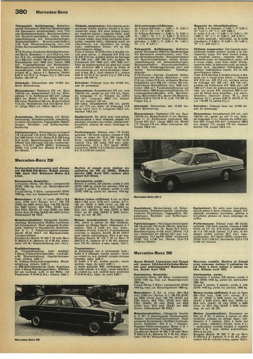 ... 230 Lang: Radstand 340 cm, Bodenfreiheit 17,5 cm, Wendekreis 12,9 (mit Servo 13,1) m. Länge 533,5 cm, Höhe 148,5 cm. Ausrüstung: Serienmässig mit Scheibendusche, Scheibenwischer zweistufig, vorderen Einzelsitzen, Tageszähler, Nebellampen, Rückfahrund Kofferraumbeleuchtung. Fahrleistungen : Höchstgeschwindigkeit 175 (Automat 170) km/h (Werk), Geschw. bei 1000 U/min im dir. Gang 31,5, 230 Lang 31,8 km/h; Beschleunigung 0-100 km/h(Werk) 13,3, 230 Lang 13,9 sec; Leistungsgew. 11,3-12,7 kg/PS (DIN); Verbrauch(DIN) 11,2 L/100 km, (Reise) 9-15 L/100 km (Werk). Mercedes-Benz 250 Sechszylinder-Limousine und -Coupé mit 130-DIN-PS-Motor. Debüt Januar 1968. April 1972: Grösserer Motor (2,8Liter). Karosserien, Gewichte: Limousine 4türig, 5/6 Sitze; Leergewicht(DIN) 1390 kg, max. zul. Gesamtgewicht 1910 kg; Coupé 2türig, 5 Sitze; Leergewicht (DIN) 1390 kg, max. zul. Gesamtgewicht 1910 kg. Motordaten: 6 Zyl. in Linie (86,5x78,8mm), 2778 cm=; Kompr. 8,7:1; 130 PS(DIN) bei 5000 U/min bzw. 146 PS (SAE) bei 5400 U/min, 46,8 PS/L (DIN) bzw. 52,5 PS/L (SAE); 22 mkg (DIN) bei 3200 U/min bzw. 24 mkg (SAE) bei 3400 U/min;'Oktanbedarf 98 ROZ. Motorkonstruktion: Hängende Ventile;obenlieg. Nockenwelle (Kette); Leichtmetall-Zylinderkopf; 7fach gelagerte Kurbelwelle; Oelfilter im Hauptstrom, Oelkühler, Oel 6 L; 2 Fallstromregistervergaser Zenith 35-40 INAT mit ...