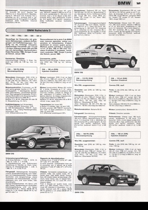 ... Debüt November 1990. 2türiges Coupé ab Detroit, Januar 1992. Karosserien, Gewichte: Limousine/Coupé 2/4türig, wicht leer (DIN) ab 1190 1650 kg. Sitze; , max. Gezul. Renouvellement de la série 3 de BMW avec mesures agrandies, autres suspensions et transmissions. D'abord seulement en version quatre portes. Moteurs quatre cylindres 2 soupapes 1,6 et 1,8 litre, 320i et 325i avec nouveaux 6-cylindres 4 soupapes. Lancement novembre 1990. Coupé 2 portes dès Detroit, janvier 1992. Carrosseries, poids: Berline/coupé 2/4 portes, 5 places; poids à vide (DIN) dès 1190 kg, tot. admiss. 1650 kg. 316i - 100 PS (DIN)Benzineinspritzung 316i - 100 ch (DIN)Injection d'essence Motordaten (Katalysator, DIN): 4 Zyl. in Linie (84x72 mm), 1596 cm'; Kompr. 9:1; 73 kW (100 PS) bei 5500/min, 45,7 kW/L (62,7 PS/L); 141 Nm (14,4 mkp) bei 4250/min; Oktanbedarf 91 ROZ. Motorkonstruktion: Frontmotor, um 30° nach rechts geneigt. Ventile in V 14°, hydr. Spielausgleich; 1 obenliegende Nockenwelle (Zahnriemen); Leichtmetall-Zylinderkopf; 5fach gelagerte Kurbelwelle; Öl 4,0 L; digitale Motorelektronik (Einspritzung/Zündung) Bosch Motronic DME M1.7. Batterie 12 V 46 Ah, Alternator 65 oder 90 A; Wasserkühlung, Inh. 6,0 L. Kraftübertragung (auf Hinterräder): a) 5-Gang-Getriebe, Achsunters. 3,45; ...