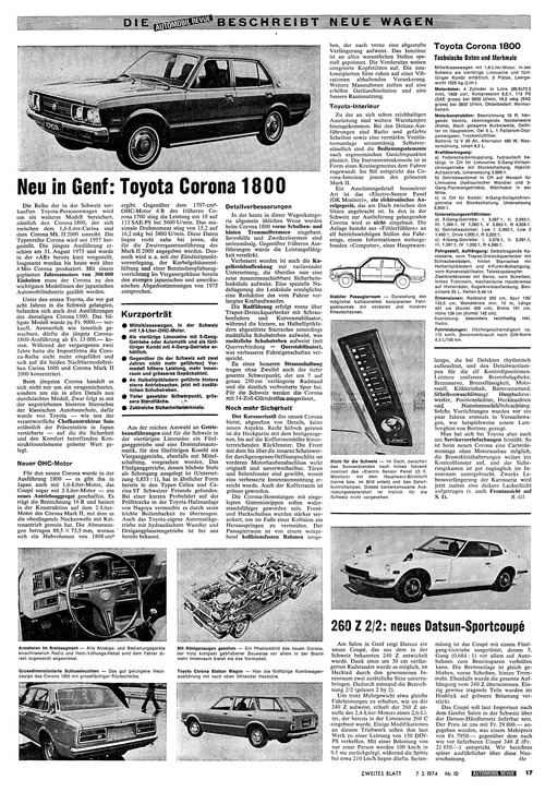 ... Carina 1600 und Corona Mark II 2000 konzentriert. Beim jüngsten Corona handelt es sich nicht nur um ein neugezeichnetes, sondern um ein in allen Details neu durchdachtes Modell. Zwar folgt es mit der angetriebenen hinteren Starrachse der klassischen Autobauschule, dafür wurde von Toyota — wie uns der verantwortliche Chefkonstrukteur Sato anlässlich der Präsentation in Japan versicherte — auf die die Sicherheit und den Komfort betreffenden Konstruktionselemente grösster Wert gelegt. Für den neuen Corona wurde in der Ausführung 1800 — es gibt ihn in Japan auch mit 1,6-Liter-Motor, das Coupe sogar mit 2-Liter-Motor — ein neues Antriebsaggregat geschaffen. Es trägt die Bezeichnung 16 R und basiert in der Konstruktion auf dem 2-Liter- Motor des Corona Mark n, mit dem es die obenliegende Nockenwelle mit Kettenantrieb gemein hat. Die Abmessungen betragen 88,5 X 73,5 mm, woraus sich ein Hubvolumen von 1808 cm' ergibt. Gegenüber dem 1707-cm3- OHC-Motor 6 R des früheren Corona 1700 stieg die Leistung um 10 auf 113SAE-PS bei 5600 U/min. Das maximale Drehmoment stieg von 15,2 auf 16,2 mkg bei 3800 U/min. Diese Daten liegen recht nahe bei jenen, die für die Zweivergaserausführung des Mark II2000 angegeben werden. Dennoch wird u. a. mit der Zündzeitpunktvorverlegung, der Kurbelgehäuseentlüftung und einer Benzindampfabsaugvorrichtung im ...