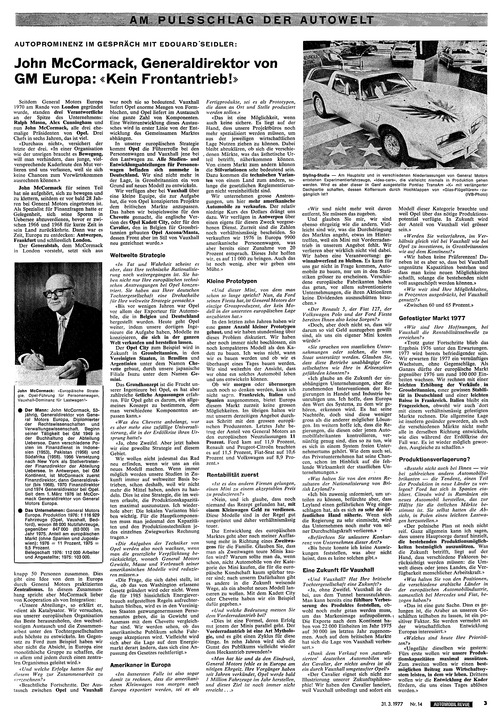 ... und schliesslich London. Der Generalstab, dem McCormack in London vorsteht, setzt sich aus John McCormack: «Europäische Strategie, Opel-Führung für Personenwagen, Vauxhall-Dominanz für Lastwagen!» 0 Der Mann: John McCormack, 53- jährig, Generaldirektor von General Motors Europa, Diplomierter der Rechtswissenschaften und Verwaltungswissenschaft. Beginn seiner Tätigkeit bei GM 1949 in der Buchhaltung der Abteilung Uebersee. Dann verschiedene Posten im Finanzdienst in Indonesien (1953), Pakistan (1956) und Südafrika (1958). 1966 Versetzung nach New York als Stellvertretender Finanzdirektor der Abteilung Uebersee. In Antwerpen, bei GM Kontinent, ist McCormack zuerst Finanzdirektor, dann Generaldirektor (bis 1968). 1970 Finanzdirektor und 1974 Generaldirektor bei Opel. Seit dem I.März 1976 ist McCormack Generaldirektor von General Motors Europa. 0 Das Unternehmen: General Motors Europa. Produktion 1976: 1 116 929 Fahrzeuge (Opel, Vauxhall, Bedford), wovon 88 000 Nutzfahrzeuge, gegenüber 847 000 (63 000) im Jahr 1975. Anteil am europäischen Markt (ohne Spanien und Jugoslawien): 1976 = 11 Prozent, 1975 = 9,5 Prozent. Belegschaft 1976: 112 000 Arbeiter und Angestellte; 1975: 103 000. war noch nie so bedeutend. Vauxhall liefert Opel enorme Mengen von Formblechen, und Opel liefert im Austausch eine ganze Zahl von Komponenten. Eine Weiterentwicklung dieses ...